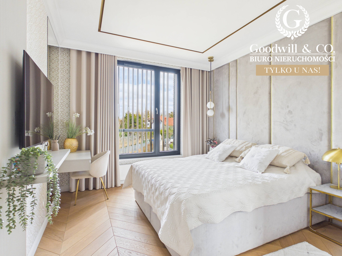 Wnętrze zostało wykończone z wykorzystaniem wysokiej klasy materiałów - drewniane podłogi, spójna zabudowa stolarska oraz nowoczesne rozwiązania podnoszące komfort codziennego życia.