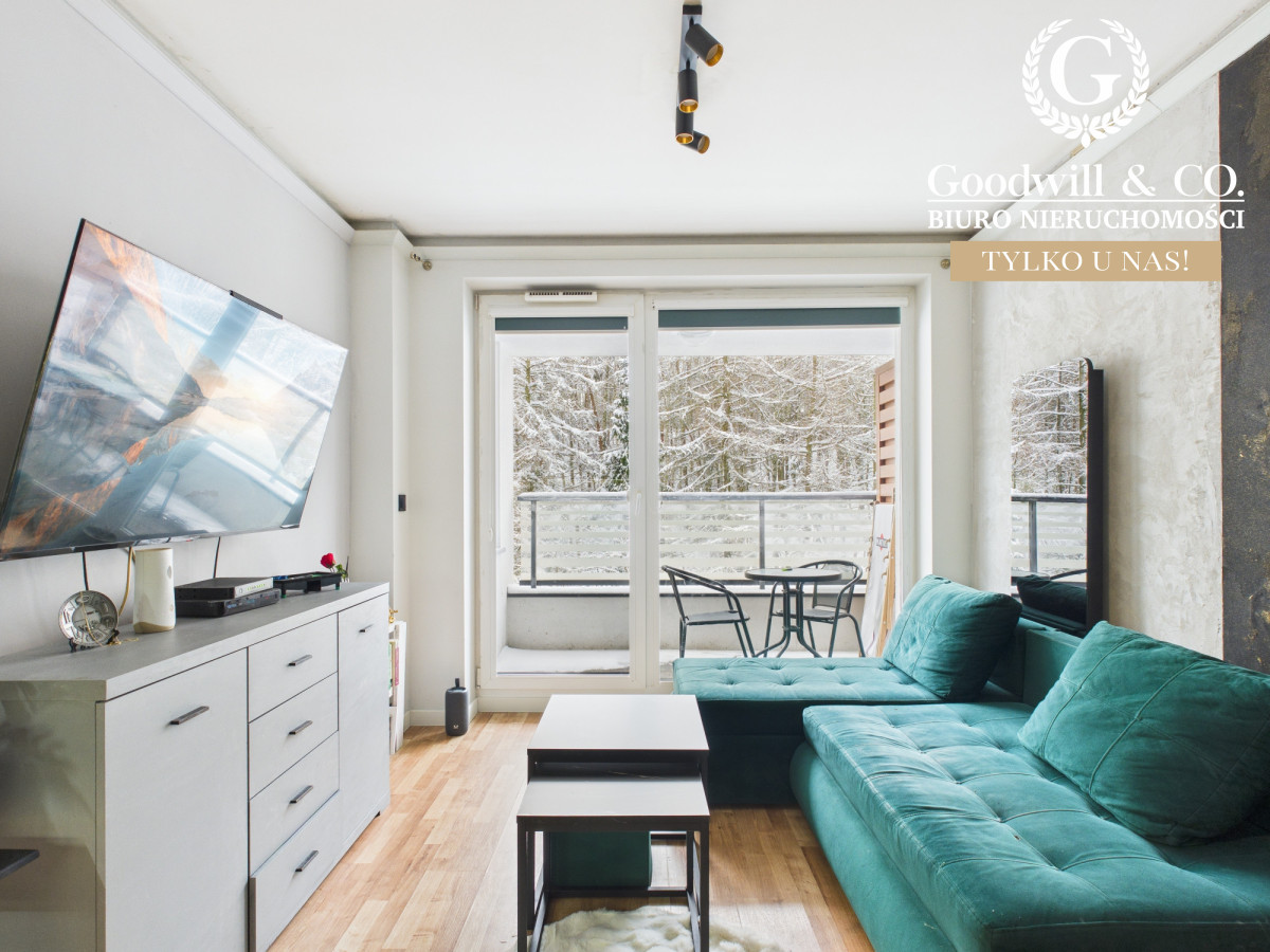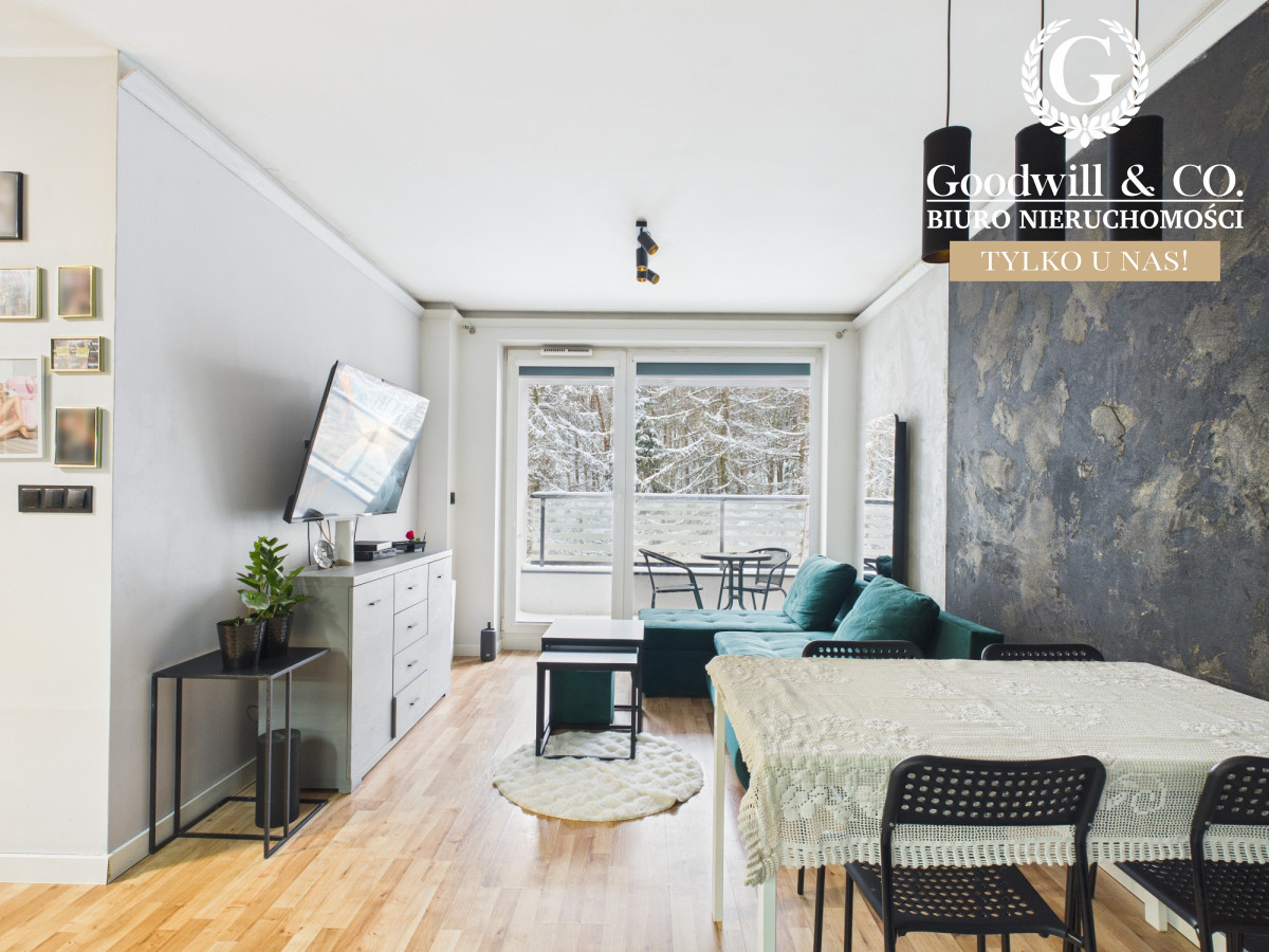 balkon z widokiem na las. Przed budynkiem znajdują się liczne ogólnodostępne miejsca parkingowe.