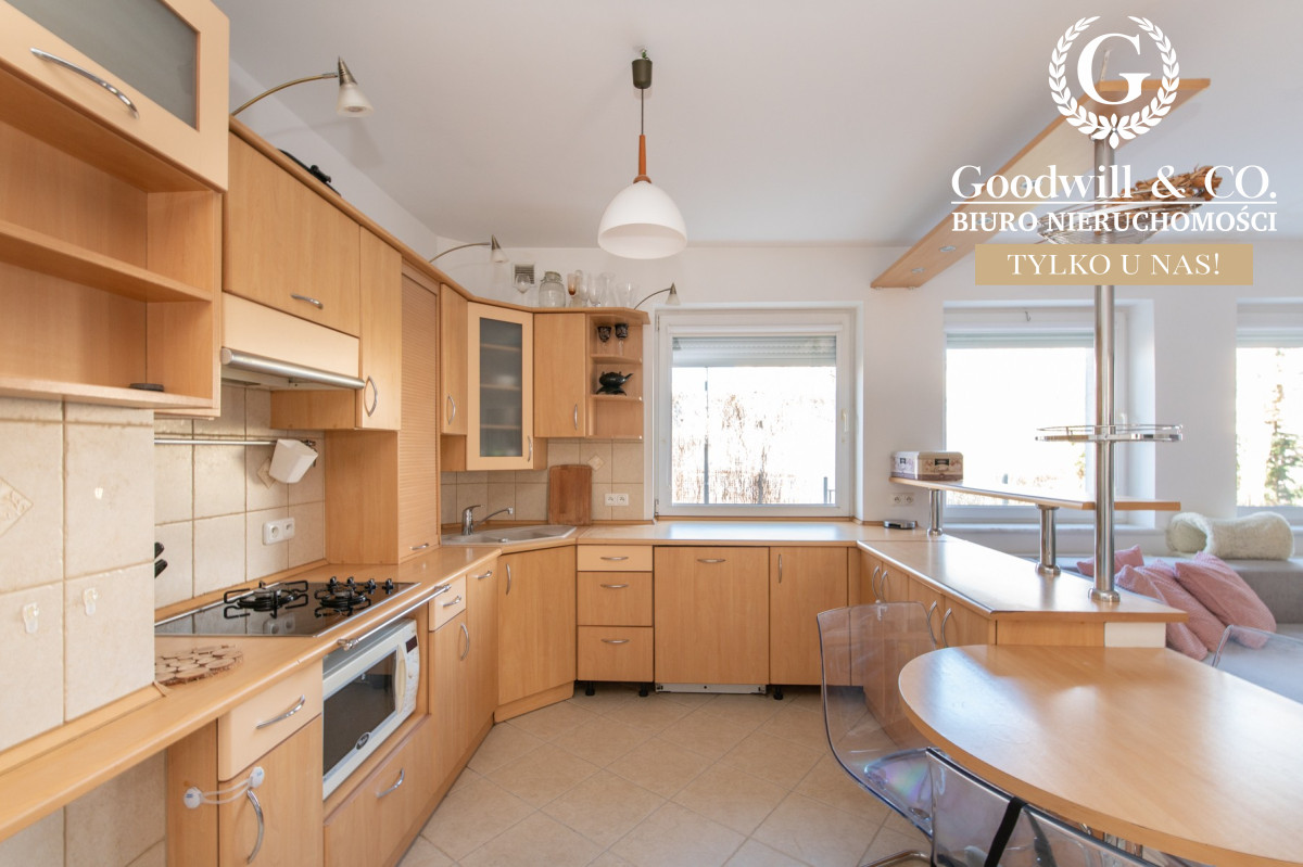Duży aneks kuchenny, zagospodarowany tak, by w pełni korzystać z całej powierzchni.