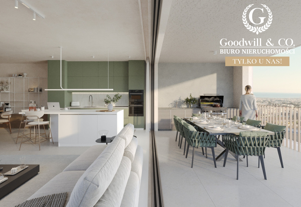 Przestronny salon z jadalnią - elegancko zaaranżowany open space z bezpośrednim wyjściem na taras o pow. ok. 40m2 i widokiem na morze.