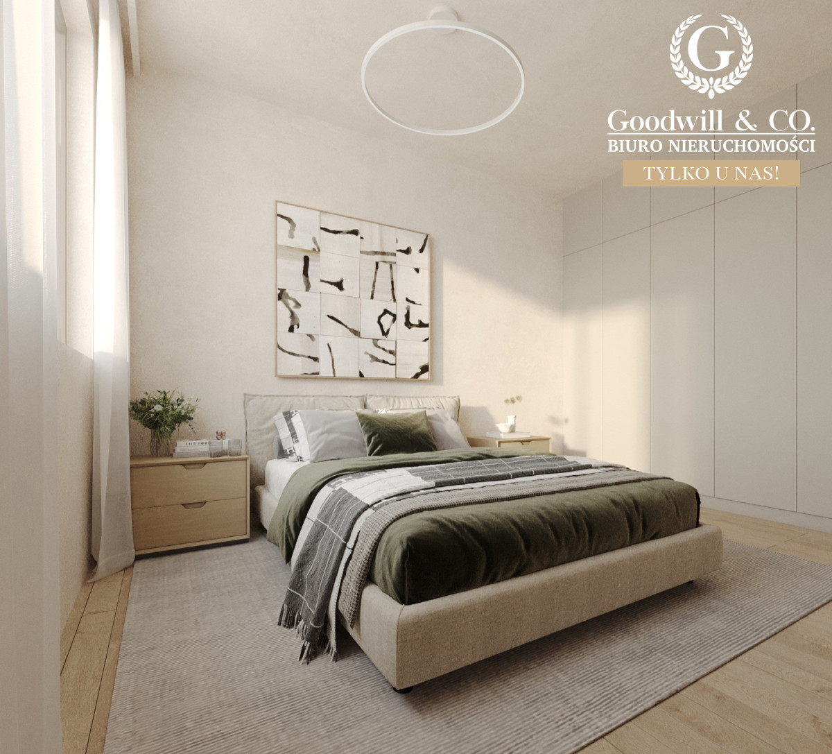 Sypialnie w stylu boutique hotelowym - komfortowe, jasne i przytulne, z pojemnymi szafami i nowoczesnymi detalami.