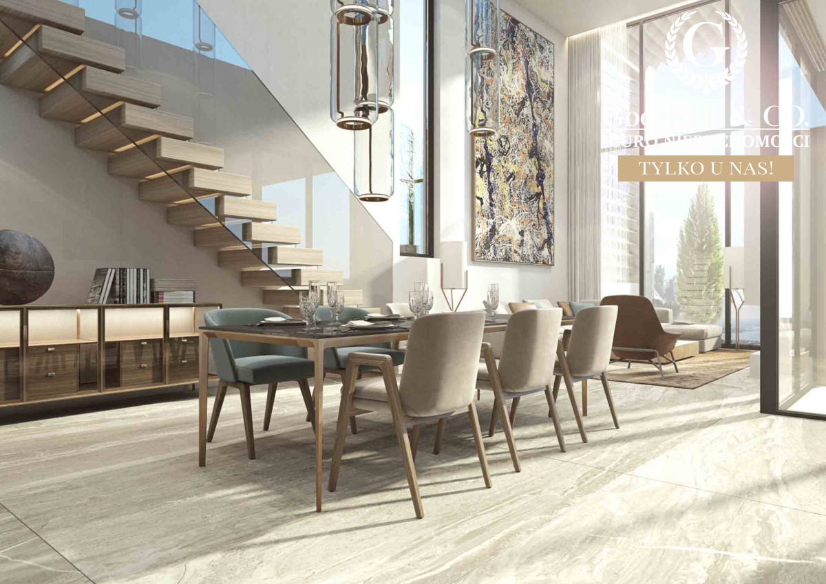 Przestronny salon z jadalnią - elegancko zaaranżowany open space z bezpośrednim wyjściem do ogrodu i widokiem na basen.